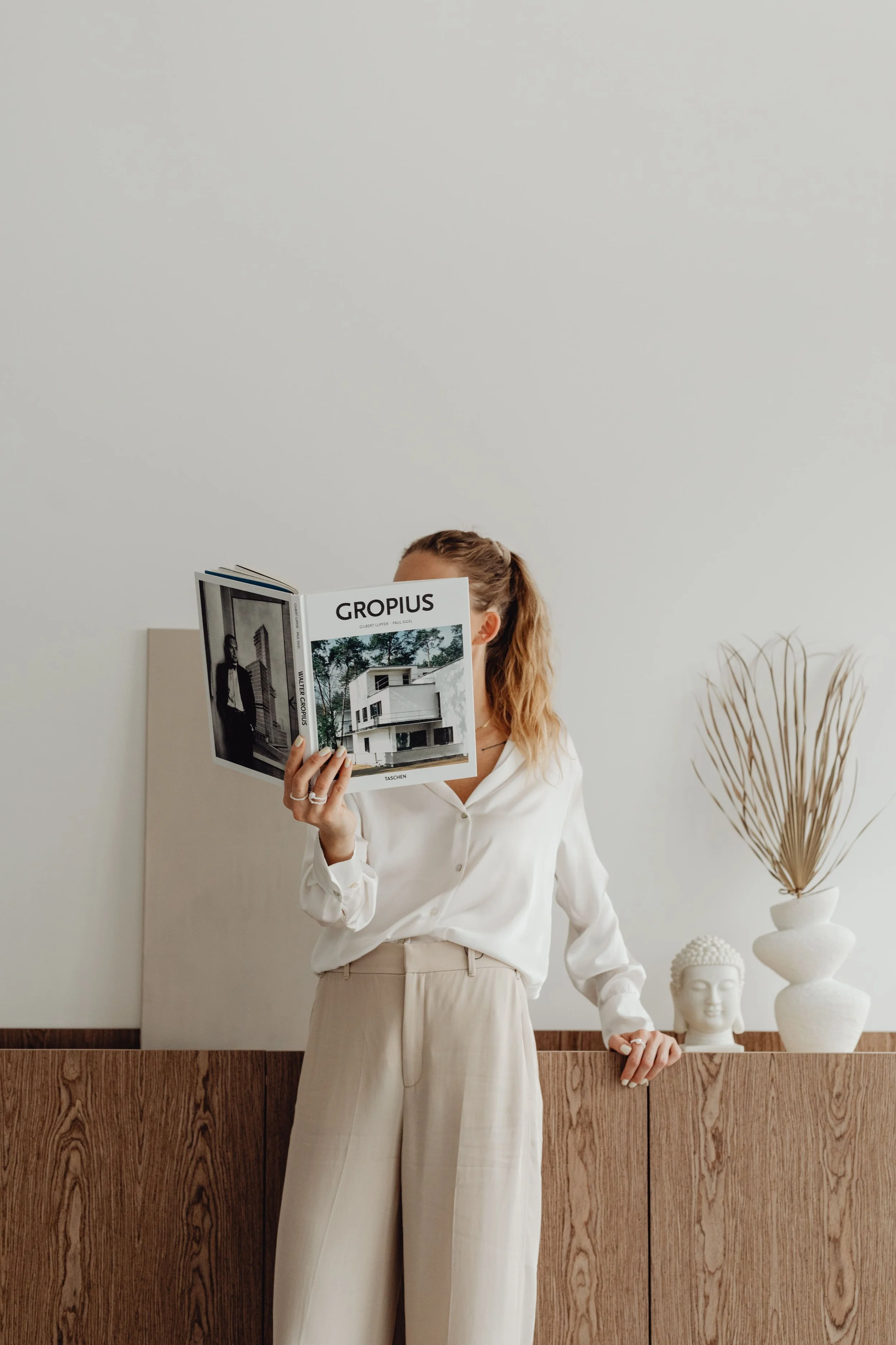 Woman in white blouse and beige trousers reading a large architecture magazine, standing beside a wooden cabinet with decorative vases and a plant.